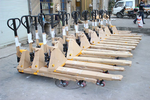 液壓搬運車是一種小巧方便,使用靈活,載重量大,結實耐用的貨物搬運工具,俗稱"地牛"。搬運車除了具有托運貨物的功能外,為了方便起降貨物,車地盤與輪之間帶有液壓裝置,可以方便的將車推入貨箱底座之下,然后用液壓將地盤升高,托起貨物,便可拖動貨物移動,到達目的地后,用液壓將底盤降落,貨物也隨之落地,可以方便的抽出搬運車,省去了人力搬運的復雜過程。